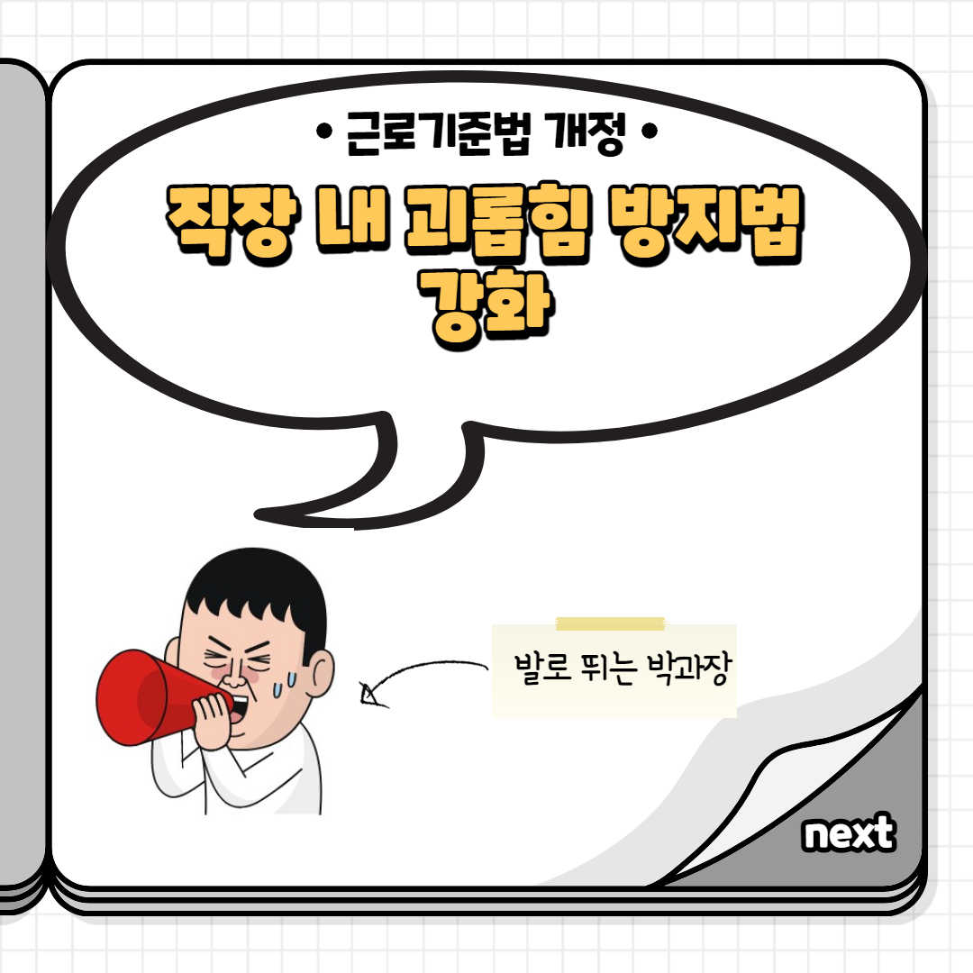 - 그동안 기준과 처벌 방법이 모호했지만 명확한 규정 신설, 하지만 5인 미만 사업장, 하청 간접고용 노동자는 아직 미적용 입니다.